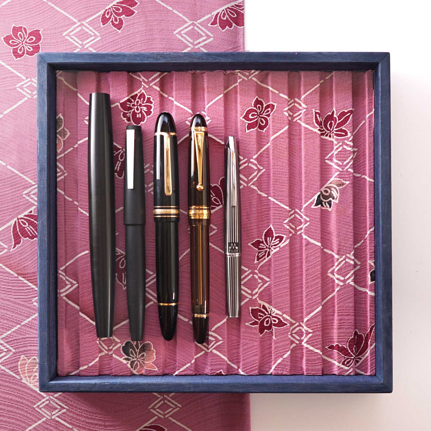 Kiri (Paulownia wood) pen tray with vintage kimono insole.