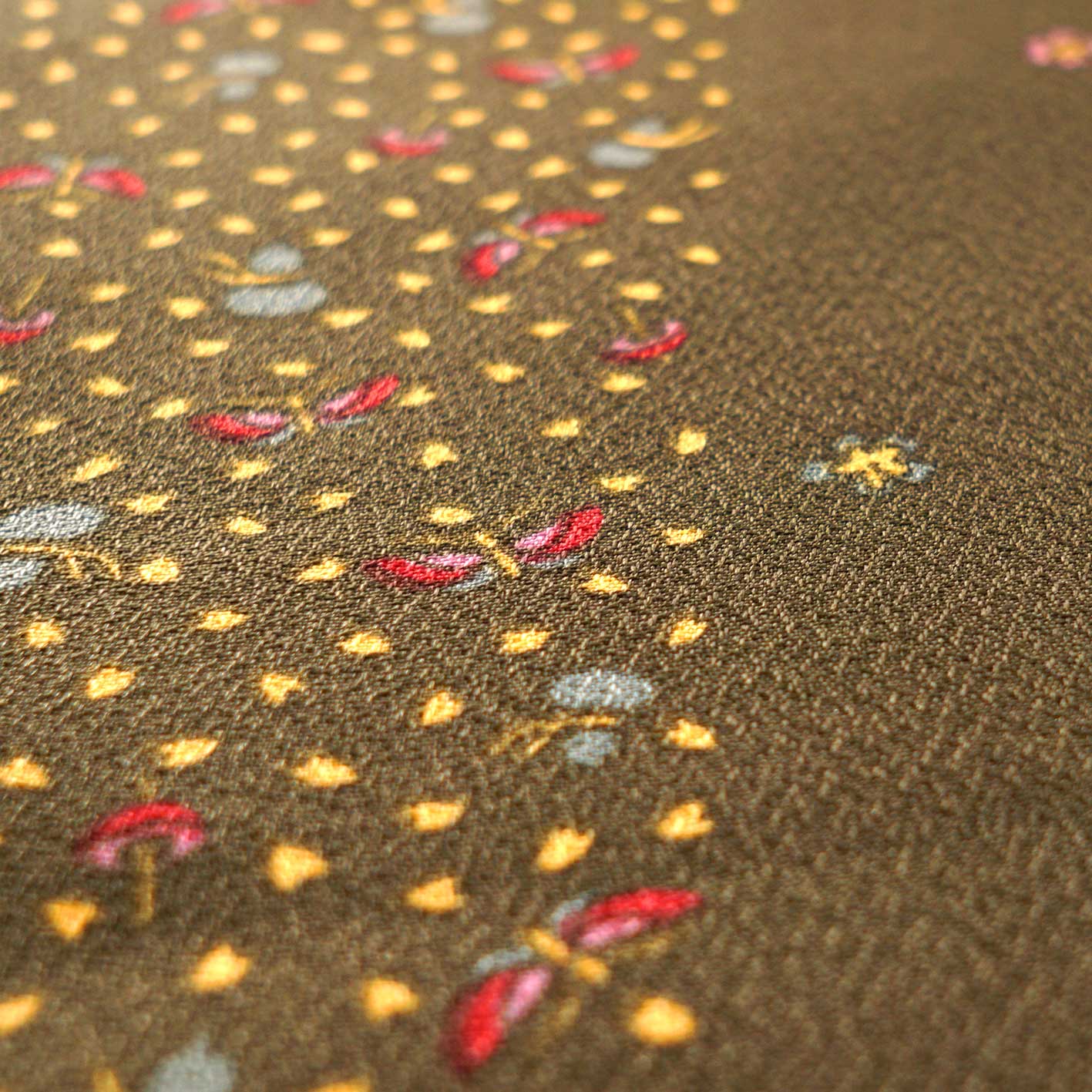 This luxurious kimono features small butterflies flying on an olive-colored background. It is slightly thicker and has a soft but slightly textured surface.