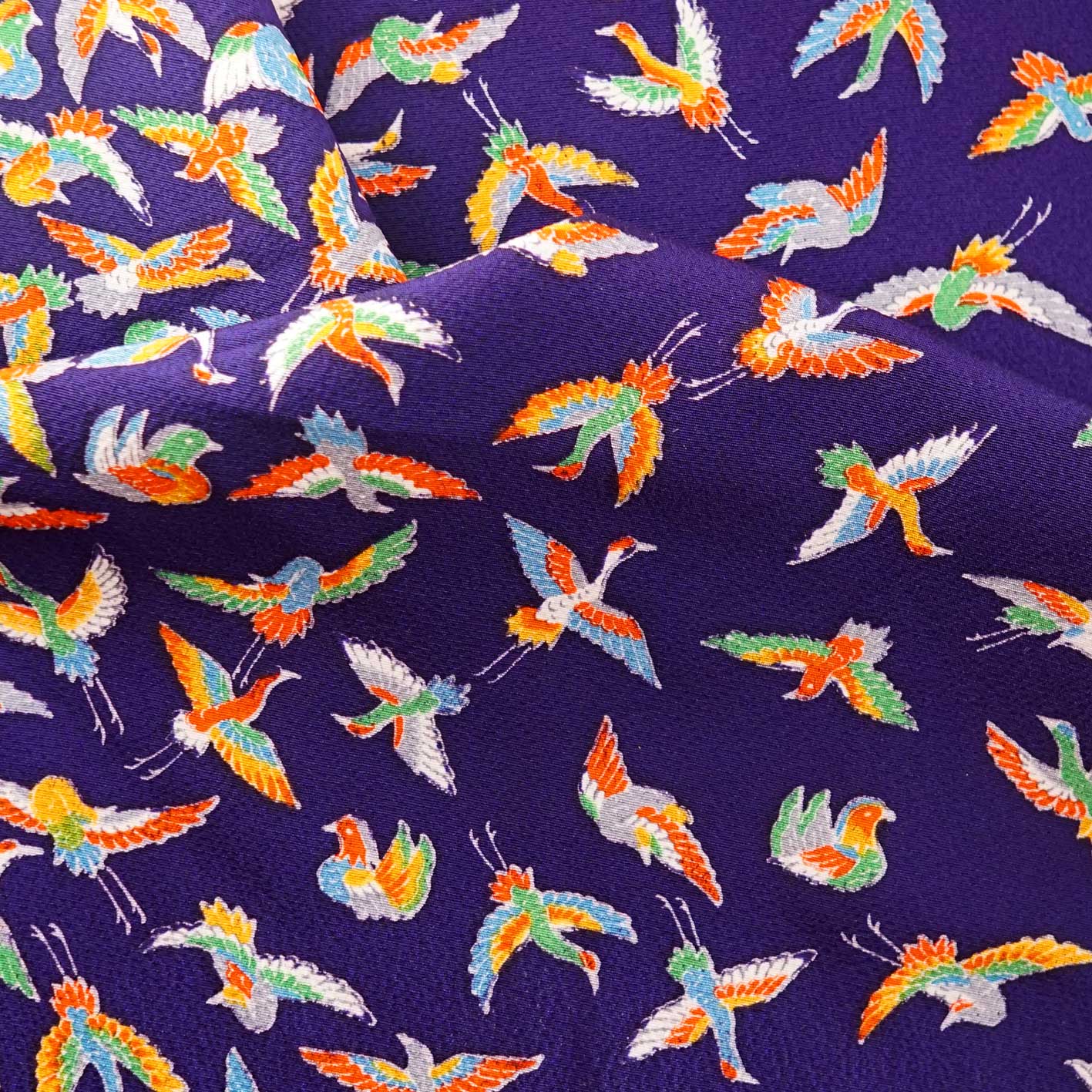 This vintage silk kimono has a lovely pattern with colorful birds flying on a slightly darker blue background.